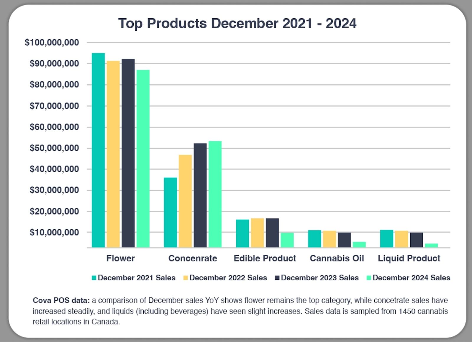 The data don’t lie: Flower is the undisputed top-selling cannabis product category. In December 2024, flower accounted for more than 40% of total retail sales in the U.S. while bringing in more than $87 million for Canadian retailers, according to Cova’s internal data. To make the most of the December bump, bundle flower with edibles or accessories to make holiday sampler packs and gift boxes.