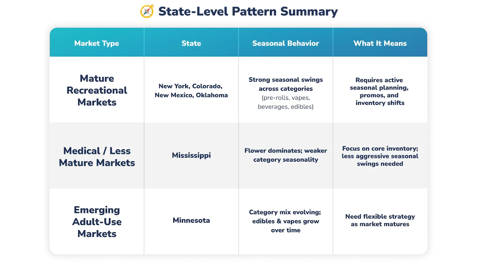 Adjust by market, not just by calendar. If you operate in both mature rec markets and newer or medical-dominant ones, your seasonal plans should differ. A Beverly Hills and a rural Mississippi dispensary should not be stocking the same seasonal assortment on the same timeline.