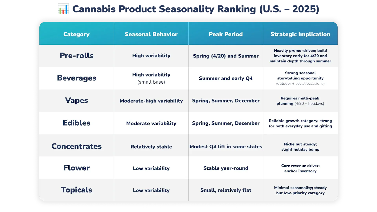 Based on the 2025 data, here is how the major cannabis product categories rank by seasonal variability in the U.S.: