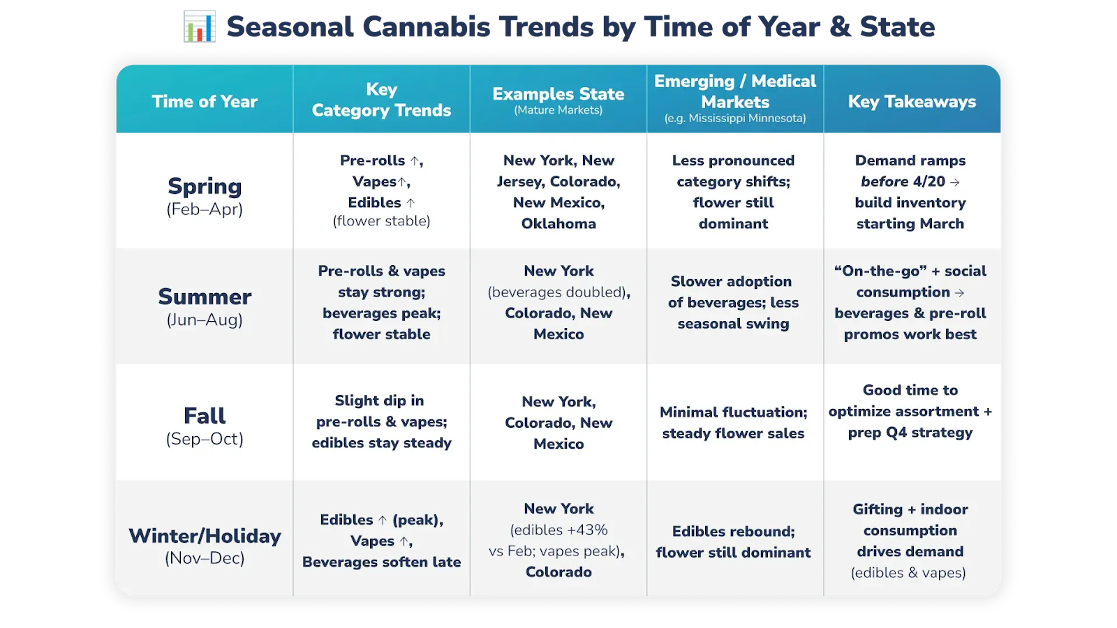 Peak periods vary by market and cannabis product category. Based on 2025 state-level data, spring and summer produce meaningful demand lifts for inhalable and portable categories. November and December generate a second wave for edibles and vapes, driven by holiday gifting and indoor consumption occasions. Flower, the largest single category, is relatively stable year-round rather than peaking sharply in any single season.