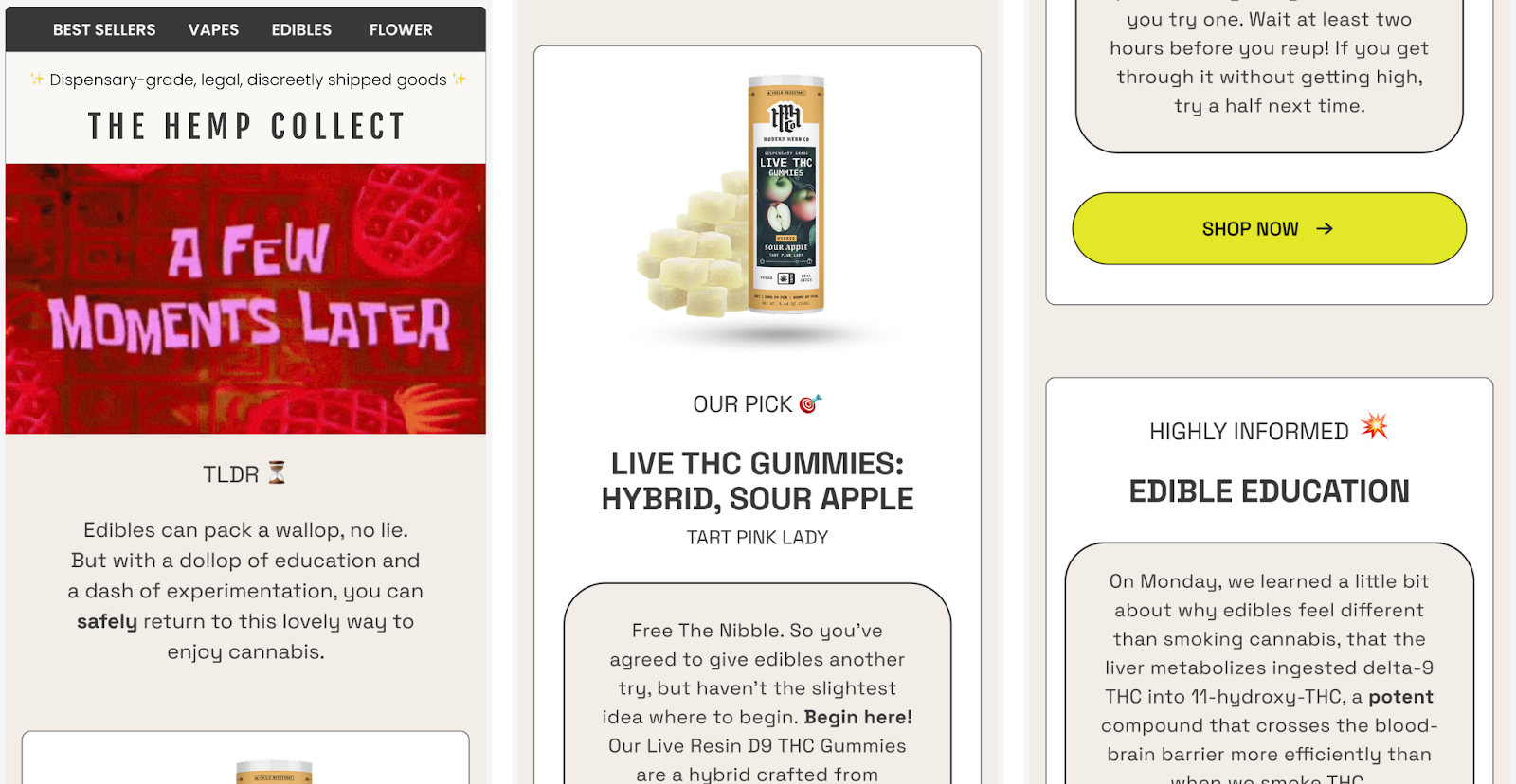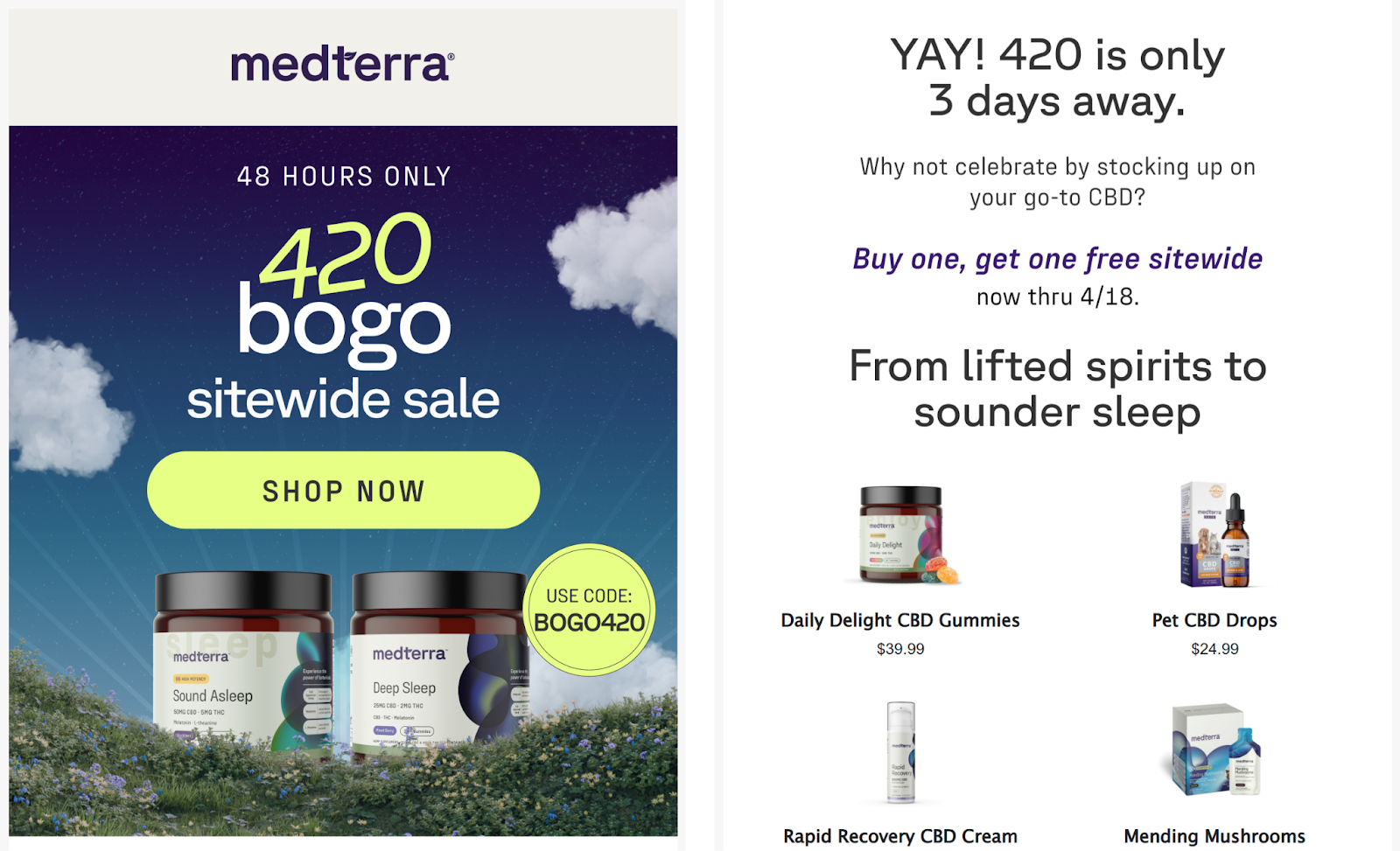 Editor’s Note: Since 4/20 is on a Monday this year, lean into products that fit a workday. Pre-rolls, gummies, beverages, vape cartridges – anything that requires zero preparation and is easy to consume after work. Your product recommendations emails in the final days before 4/20 should emphasize convenience.